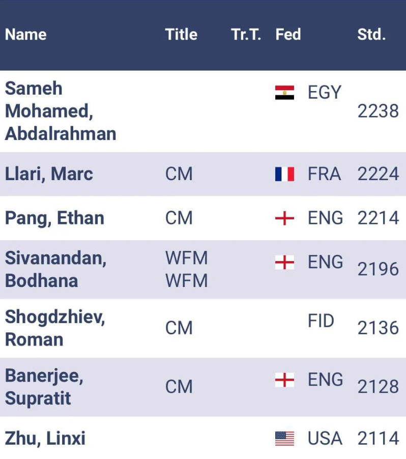 واستعان حساب الاتحاد المصري للشطرنج بصورة من الترتيب الذي يصدره الاتحاد الدولي للعبة، والذي أظهر عبد الرحمن سامح في الصدارة برصيد 2238 نقطة، فيما حل الفرنسي مارك لاري في المركز الثاني برصيد 2224.