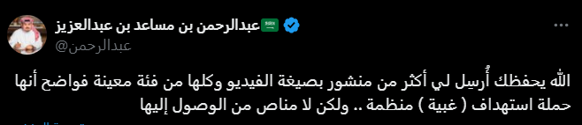 وأوضح بن مساعد سبب الرد على الاتهامات، حيث كتب: "أُرسِل لي أكثر من منشور بصيغ مشابهة، وكلها من فئة معينة فواضح أنها حملة استهداف غبية".