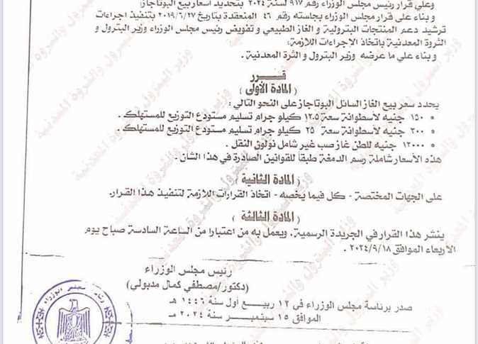 ووفقًا للقرار، طبقت وزارة البترول والثروة المعدنية زيادة سعر بيع الغاز الصب لـ12 الف.