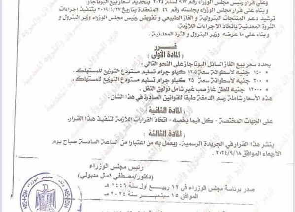 وفقا لنص قرار وزارة البترول بعد موافقة الحكومة، فقد قررت وزارة البترول بدء العمل بزيادة أسعار إسطوانات الغاز المنزلي والتجاري، وجاء في نص القرار التالي:
