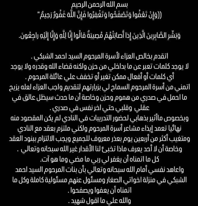 ونشر فتوح بيانا عبر حسابه على "إنستجرام"، جاء فيه: "أتقدم بخالص العزاء لأسرة المرحوم السيد أحمد الشوبكي، لا توجد كلمات تعبر عما بداخلي من حزن، ولكنه قضاء الله وقدره، ولا يوجد أي كلمات أو أفعال ممكن تغير، أو تخفف على عائلة المرحوم".
