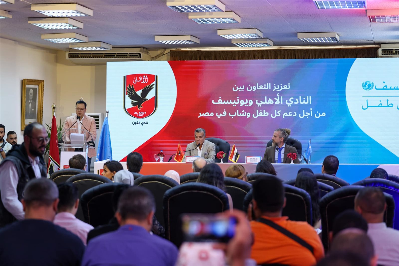 وعُقد اليوم الخميس، مؤتمرا صحفيا بمقر النادي الأهلي بمنطقة الجزيرة بالقاهرة، بحضور أعضاء مجلس الإدارة، وجيرمي هوبكينز ممثل يونيسف في مصر.