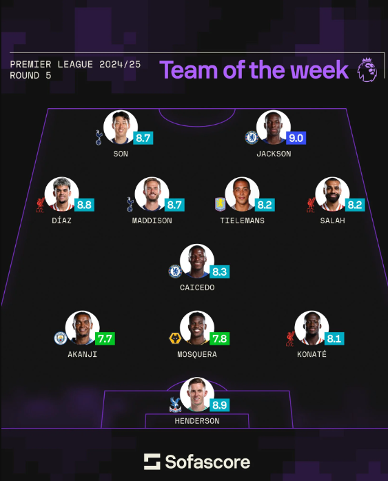خط الوسط: كايسيدو (تشيلسي)، تيلمانس (أستون فيلا)، ماديسون (توتنهام)، لويس دياز (ليفربول)