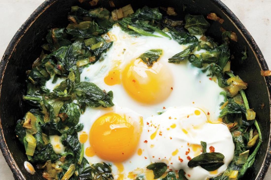 - يوضع البيض واحدة تلو الأخرى على السبانخ ويتم تقليبها برفق ثم يوضع عليها الجبن المبشورة.