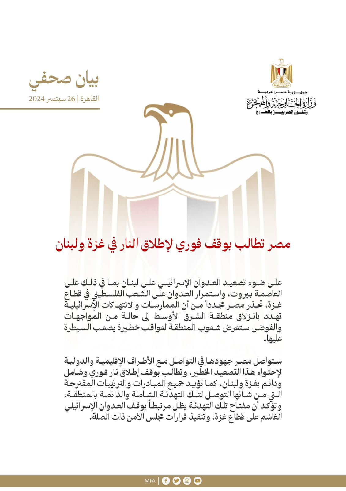 طالبت مصر بضرورة وقف الحرب الإسرائيلية على لبنان وقطاع غزة، حيث أكدت مصر عبر بيان صادر عن وزارة خارجيتها أن مفتاح التهدئة يظل مرتبطا بوقف العدوان الإسرائيلي الغاشم على قطاع غزة وتنفيذ قرارات مجلس الأمن ذات الصلة.
