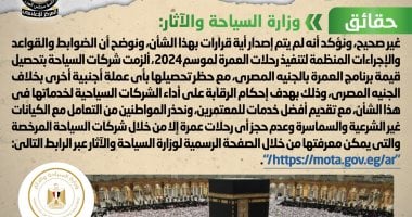 وأوضحت أن الضوابط والقواعد والإجراءات المنظمة لتنفيذ رحلات العمرة لموسم 2024، ألزمت شركات السياحة بتحصيل قيمة برنامج العمرة بالجنيه المصري، مع حظر تحصيلها بأي عملة أجنبية أخرى بخلاف الجنيه المصري، وذلك بهدف إحكام الرقابة على أداء الشركات السياحية لخدماتها في هذا الشأن، مع تقديم أفضل خدمات للمعتمرين، محذرةً المواطنين من التعامل مع الكيانات غير الشرعية والسماسرة وعدم حجز أي رحلات عمرة إلا من خلال شركات السياحة المرخصة والتي يمكن معرفتها من خلال الصفحة الرسمية لوزارة السياحة والآثار عبر الرابط التالي: "https://mota.gov.eg/ar/".