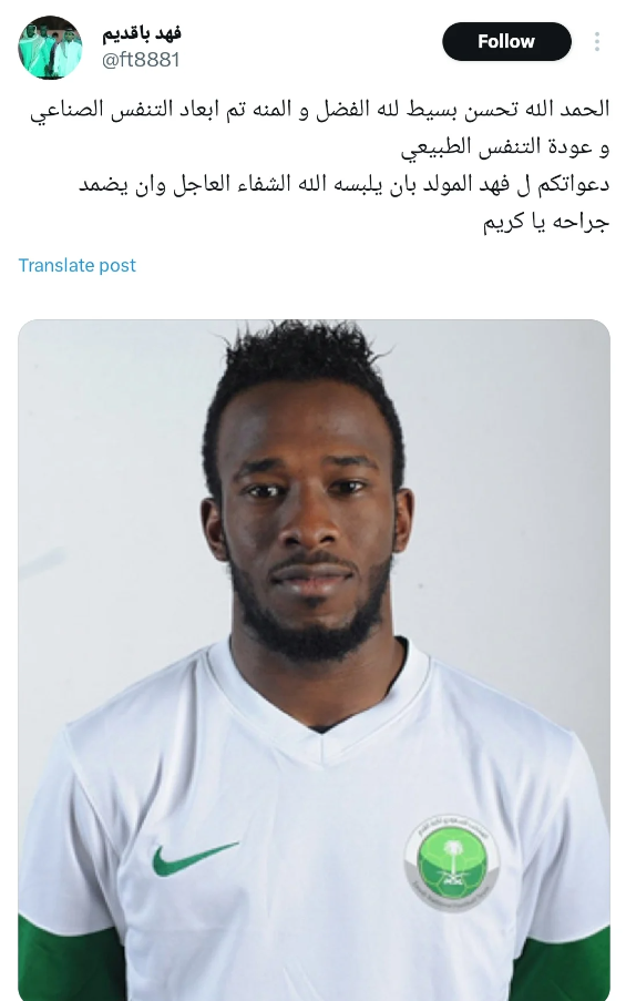 وكتب باقديم عبر حسابه الشخصي على موقع التواصل الاجتماعي "إكس": "الحمد الله تحسن بسيط لله الفضل والمنة تم إبعاد التنفس الصناعي وعودة التنفس الطبيعي".