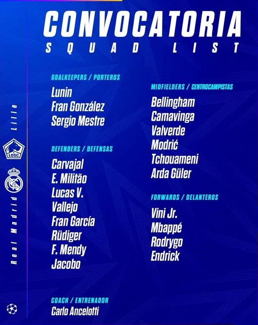 وجاءت قائمة ريال مدريد لمواجهة ليل كالتالي: