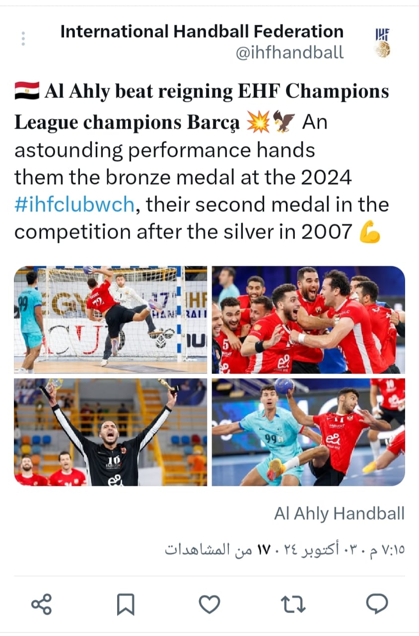 أشاد الحساب الرسمي للاتحاد الدولي لكرة اليد، بإنجاز النادي الأهلي المصري بعد حصد الميدالية البرونزية بكأس العالم للأندية على حساب برشلونة الإسباني.
