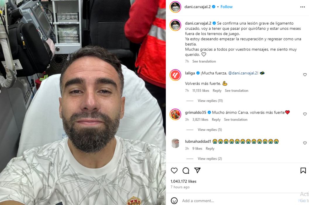 ونشر كارفخال، عبر حسابه الرسمي على إنستجرام، صورة وعلق عليها: "جرى تأكيد إصابتي الخطيرة بالرباط الصليبي، وسأضطر إلى الخضوع لعملية جراحية وأغيب عن الملعب لبضعة أشهر".