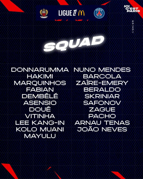 وعاد الفرنسي عثمان ديمبيلي، نجم فريق باريس سان جيرمان للقائمة بعدما أعتذر لمديره الفني لويس إنريكي، بعدما قدم اعتذاره عن سلوكه بعد مباراة ستاد رين، التي أقيمت وحسمها الفريق الباريسي بنتيجة 3 - 1.