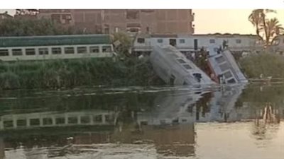 ودفعت هيئة السكك الحديدية بمعدات وأوناش لرفع عربتي قطار النوم بعد سقوطهما فى ترعة الإبراهيمية نتيجة تصادم جرارين بالقطار من الخلف.