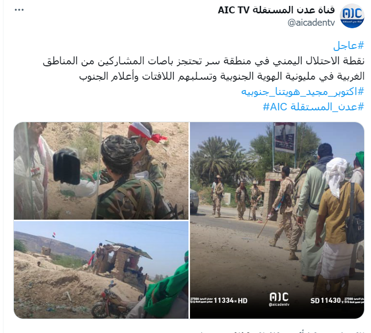 أعلنت قناة عدن المستقبلة قبل قليل بأن نقطة الاحتلال اليمني في منطقة سر قامت باحتجاز باصات المشاركين من المناطق الغربية في مليونية الهوية الجنوبية وتسلبهم اللافتات وأعلام الجنوب باليمن.