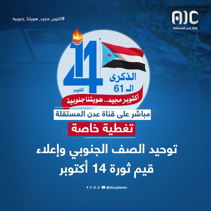 أعلنت قناة عدن المستقلة بجنوب اليمن في نبأ عاجل لها منذ قليل عن تغطية خاصة ومباشرة بعنوان "توحيد الصف الجنوبي وإعلاء قيم ثورة 14 أكتوبر".