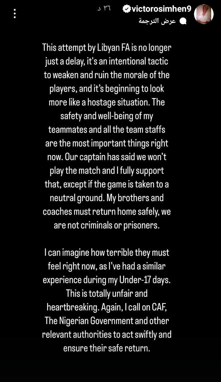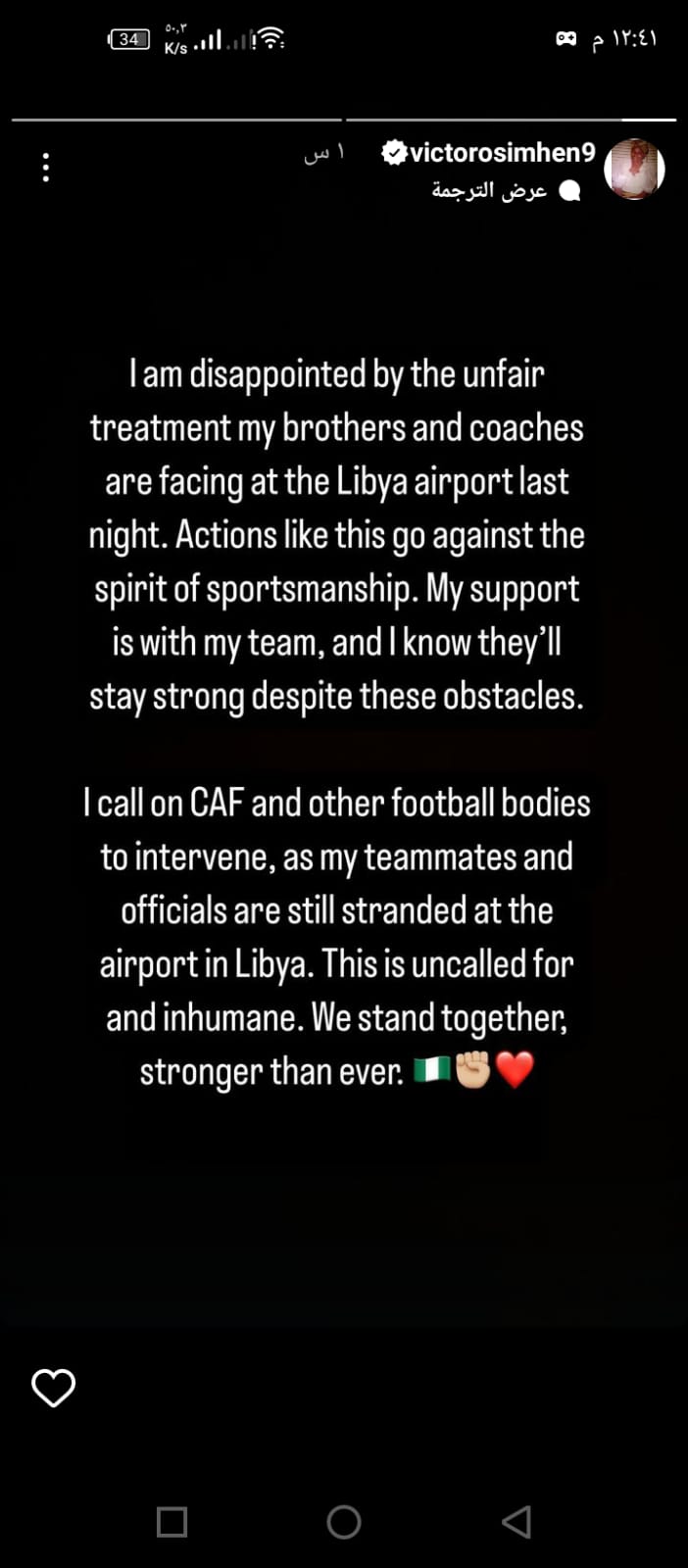 وكتب أوسيمين في رسالة عبر حسابه على موقع "إنستجرام": "أشعر بخيبة أمل إزاء المعاملة غير العادلة التي واجهها زملائي ومدربي في مطار ليبيا منذ الليلة الماضية. إن مثل هذه التصرفات تتعارض مع الروح الرياضية. أدعم فريقي وأعلم أنهم سيظلون أقوياء على الرغم من هذه العقبات".