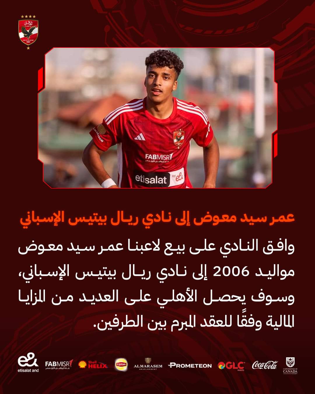 وكتب النادي الأهلي عبر موقعه الرسمي: "وافق النادي الأهلي على بيع لاعبنا عمر سيد معوض مواليد 2006 إلى نادي ريال بيتيس الإسباني، وسيحصل الأهلي على العديد من المزايا المالية وفقا للعقد المبرم بين الطرفين".
