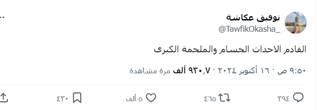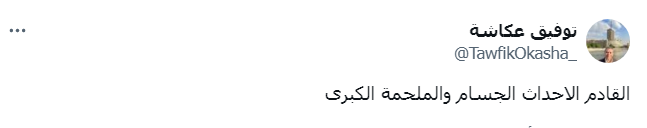 وقال توفيق عكاشة في تغريدته الغامضة والمثيرة للجدل: "القادم الأحداث الجسام والملحمة الكبرى"