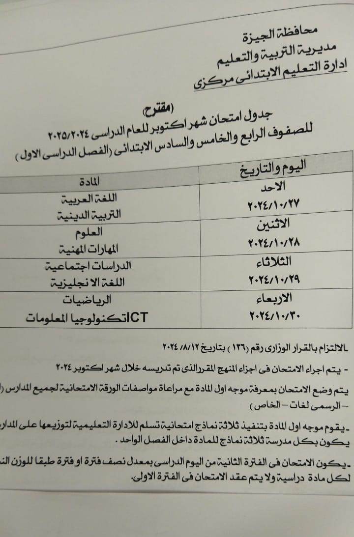 جدول امتحان شهر أكتوبر لصفوف الرابع والخامس والسادس الابتدائى بالجيزة (مستند)