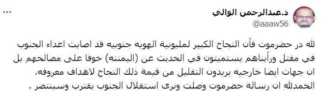 واختتم منشوره: الحمدلله ان رسالة حضرموت وصلت ونرى استقلال الجنوب يقترب وسينتصر.