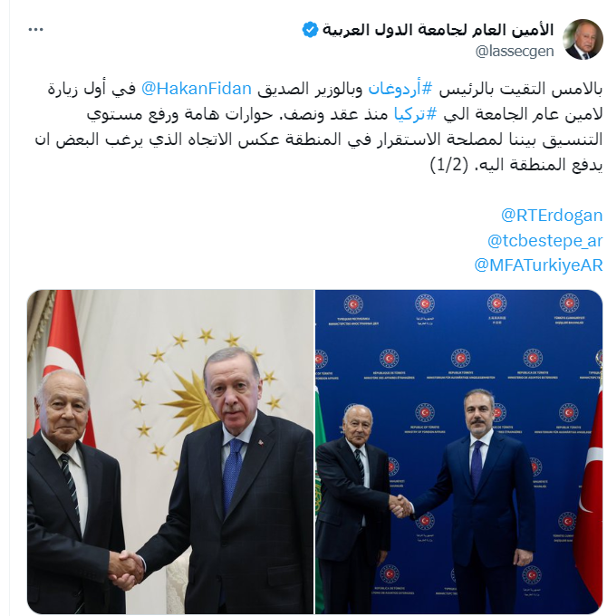 وقال أبو الغيط - في منشور عبر حسابه الرسمي على منصة (إكس) اليوم الخميس، "أمس التقيت بالرئيس التركي رجب طيب أردوغان وبوزير الخارجية الصديق هاكان فيدان، في أول زيارة لأمين عام للجامعة العربية إلى تركيا منذ عقد ونصف".