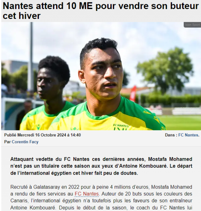 وأوضحت الصحيفة أنه لن يتم بيع مصطفى محمد من جانب نادي نانت سوى بمبلغ 10 ملايين يورو للتخلي عنه، بعدما أصبح بعيدًا عن خطط المدير الفني لفريق نانت.