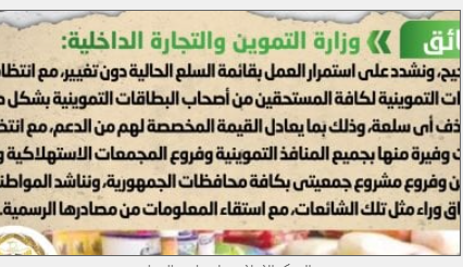 وشددت على استمرار العمل بقائمة السلع الحالية دون تغيير، مع انتظام صرف المقررات التموينية لكل المستحقين من أصحاب البطاقات التموينية بشكل طبيعي دون حذف أي سلعة، وذلك بما يعادل القيمة المخصصة لهم من الدعم، مع انتظام ضخ كميات وفيرة منها بجميع المنافذ التموينية وفروع المجمعات الاستهلاكية وبقالي التموين وفروع مشروع جمعيتي بكافة محافظات الجمهورية، مناشدةً المواطنين عدم الانسياق وراء مثل تلك الشائعات، مع استقاء المعلومات من مصادرها الرسمية.
