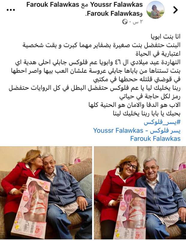 احتفلت يسرا فلوكس، ابنة الفنان فاروق فلوكس، بعيد ميلادها في أجواء عائلية، وشاركت مجموعة من الصور عبر حسابها على فيسبوك، ظهر خلالها والدها في أحدث ظهور له، حيث طمأنت يسرا الجمهور بشأن الحالة الصحية للنجم الكبير، مؤكدة أنه بخير.