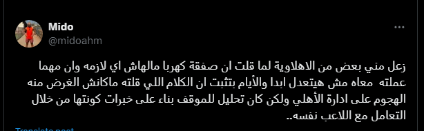 وكتب ميدو عبر صفحته الرسمية على موقع التواصل الاجتماعي "إكس": "زعل مني بعض من الأهلاوية لما قلت أن صفقة كهربا ملهاش أي لازمة، وأن مهما عملتوا معاه مش هيتعدل أبدا، والأيام بتثبت أن الكلام اللي قولته ماكنش الغرض منه الهجوم على إدارة الأهلي ولكن كان تحليل للموقف بناء على خبرات كونتها من خلال التعامل مع اللاعب نفسه".