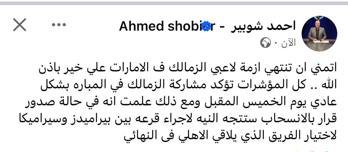 وكتب شوبير عبر صفحته الشخصية على موقع التواصل الاجتماعي "فيسبوك": "أتمنى أن تنتهي أزمة لاعبي الزمالك في الإمارات على خير، كل المؤشرات تؤكد مشاركة الزمالك في المباراة بشكل عادي يوم الخميس المقبل".