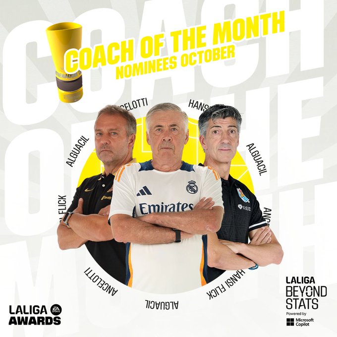 فليك خسر الجائزة الشهر الماضي، ويتنافس عليها هذا الشهر مع كارلو أنشيلوتي بعد النتائج المميزة التي حققها كل منهما، بينما إيمانويل ألجاوسيل مدرب ريال سوسيداد ينافس على الجائزة بعد أن نجح في الفوز على فالنسيا وجيرونا، وتعادل مع أتلتيكو مدريد.