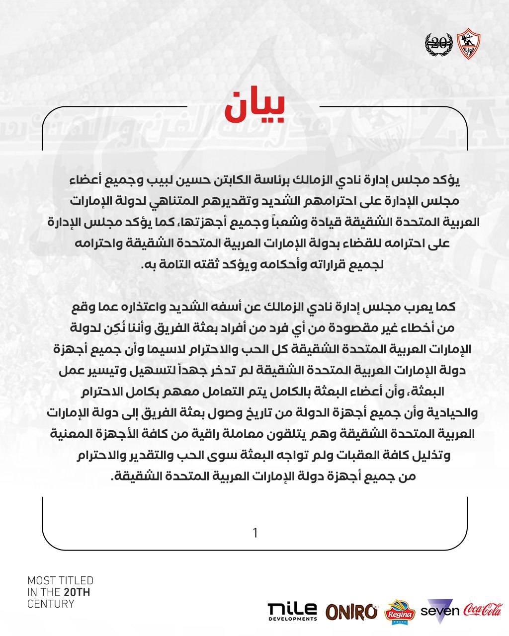 "كما يعرب مجلس إدارة نادي الزمالك عن أسفه الشديد واعتذاره عما وقع من أخطاء غير مقصودة من أي فرد من أفراد بعثة الفريق وأننا نُكِن لدولة الإمارات العربية المتحدة الشقيقة كل الحب والاحترام لا سيما وأن جميع أجهزة دولة الإمارات العربية المتحدة الشقيقة لم تدخر جهدًا لتسهيل وتيسير عمل البعثة، وأن أعضاء البعثة بالكامل يتم التعامل معهم بكامل الاحترام والحيادية وأن جميع أجهزة الدولة من تاريخ وصول بعثة الفريق إلى دولة الإمارات العربية المتحدة الشقيقة وهم يتلقون معاملة راقية من كافة الأجهزة المعنية وتذليل كافة العقبات ولم تواجه البعثة سوى الحب والتقدير والاحترام من جميع أجهزة دولة الإمارات العربية المتحدة الشقيقة".