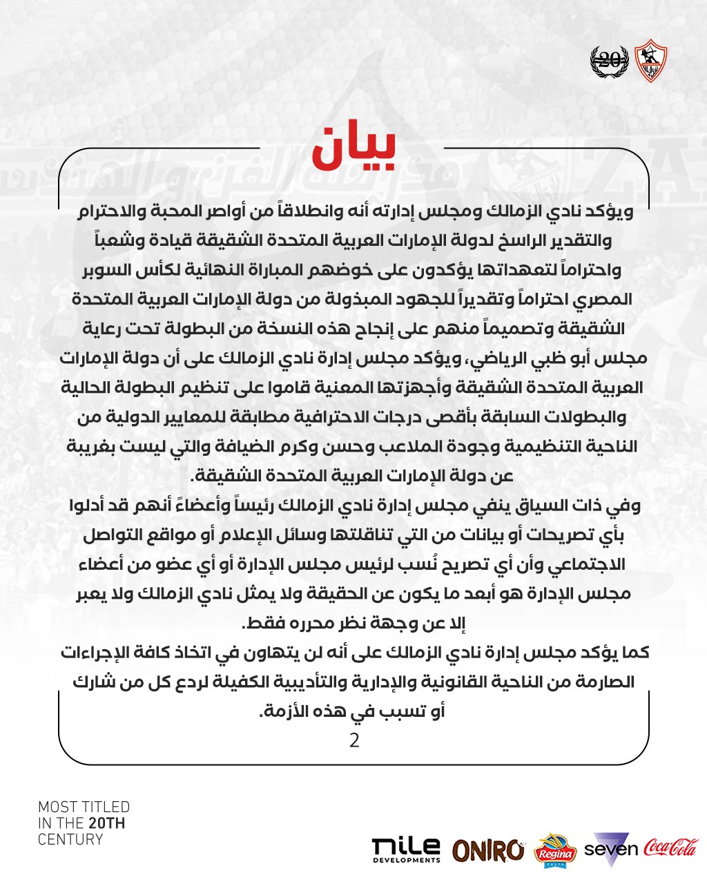 "ويؤكد نادي الزمالك ومجلس إدارته أنه وانطلاقًا من أواصر المحبة والاحترام والتقدير الراسخ لدولة الإمارات العربية المتحدة الشقيقة قيادة وشعبًا واحترامًا لتعهداتها يؤكدون على خوضهم المباراة النهائية لكأس السوبر المصري احترامًا وتقديرًا للجهود المبذولة من دولة الامارات العربية المتحدة الشقيقة وتصميمًا منهم على إنجاح هذه النسخة من البطولة تحت رعاية مجلس أبو ظبي الرياضي، ويؤكد مجلس إدارة نادي الزمالك على أن دولة الإمارات العربية المتحدة الشقيقة وأجهزتها المعنية قاموا على تنظيم البطولة الحالية والبطولات السابقة بأقصى درجات الاحترافية مطابقة للمعايير الدولية من الناحية التنظيمية وجودة الملاعب وحسن وكرم الضيافة والتي ليست بغريبة عن دولة الإمارات العربية المتحدة الشقيقة".