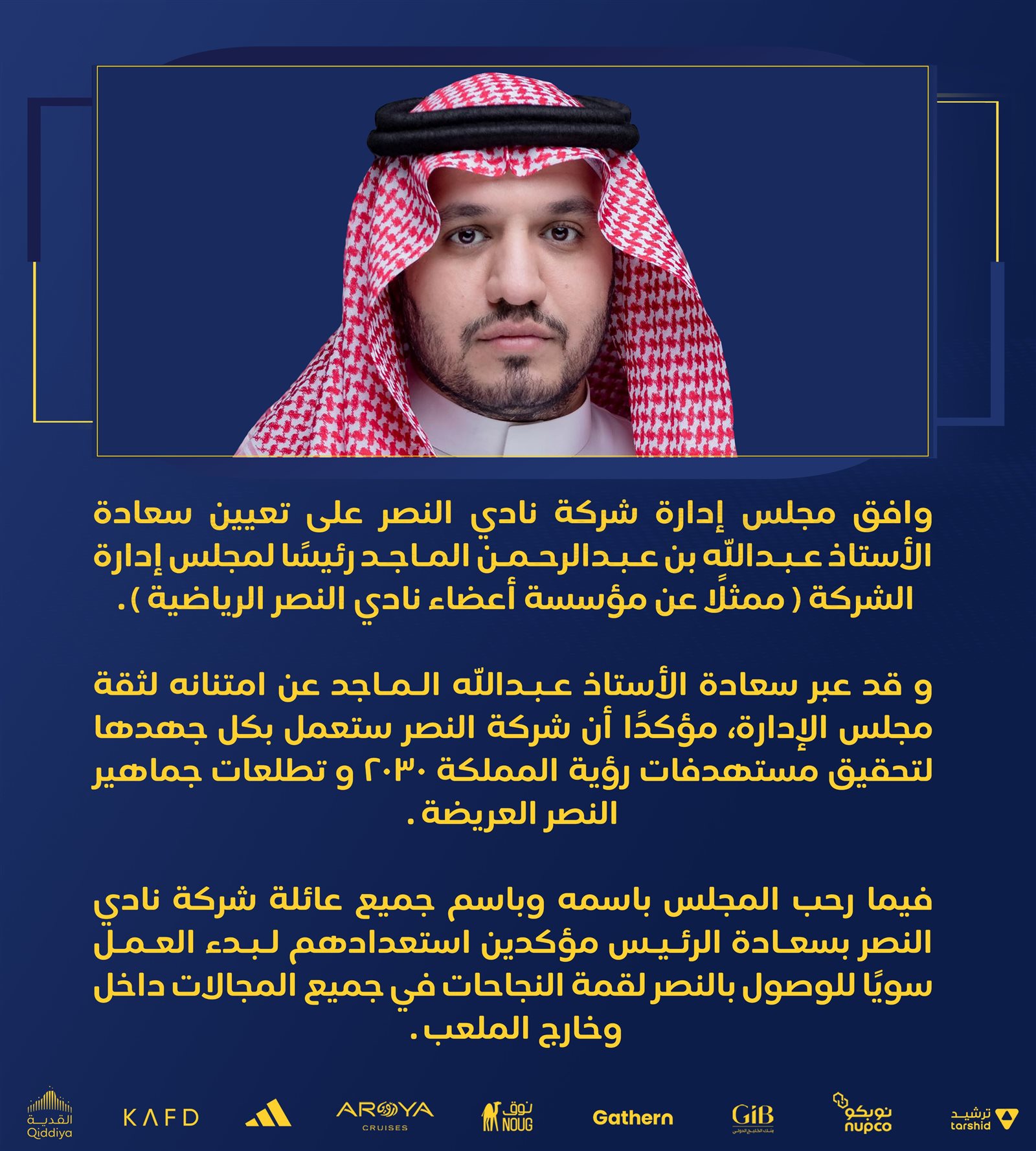 وقال النصر، في بيان رسمي، اليوم الاثنين، إن مجلس إدارة نادي النصر وافقت على تعيين عبد الله الماجد رئيسا لمؤسسة النادي ومؤسسته غير الربحية.