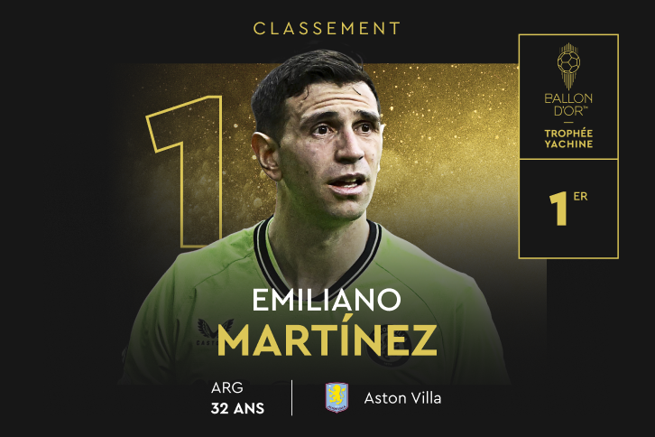توج الأرجنتيني إيميليانو مارتينيز حارس مرمى أستون فيلا الإنجليزي، بجائزة ياشين لأفضل حارس في العالم خلال حفل الكرة الذهبية 2024 "البالون دور".