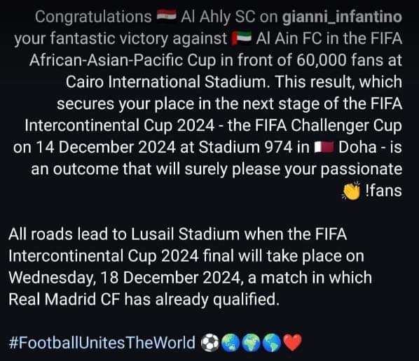 وكتب إنفانتينو عبر حسابه الرسمي على "إنستجرام": "تهانينا للأهلي على فوزه الرائع على العين الإماراتي في بطولة كأس إفريقيا وآسيا والمحيط الهادئ أمام 60 ألف مشجع في استاد القاهرة الدولي".