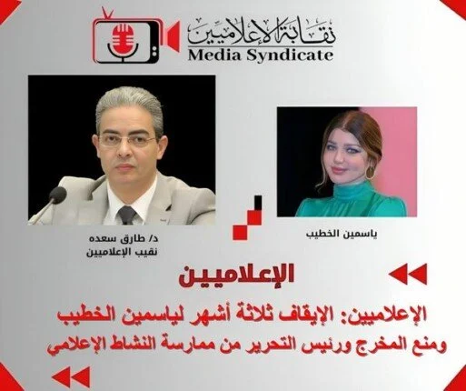أصدر الدكتور طارق سعده نقيب الإعلاميين، قرارًا بإيقاف ياسمين الخطيب ثلاثة أشهر عن ممارسة النشاط الإعلامي، حيث مثلت برفقة الهيئة القانونية لقناة النهار للتحقيق داخل مقر نقابة الإعلاميين مساء اليوم الأربعاء الموافق 30 أكتوبر 2024 في تمام السادسة مساءً.