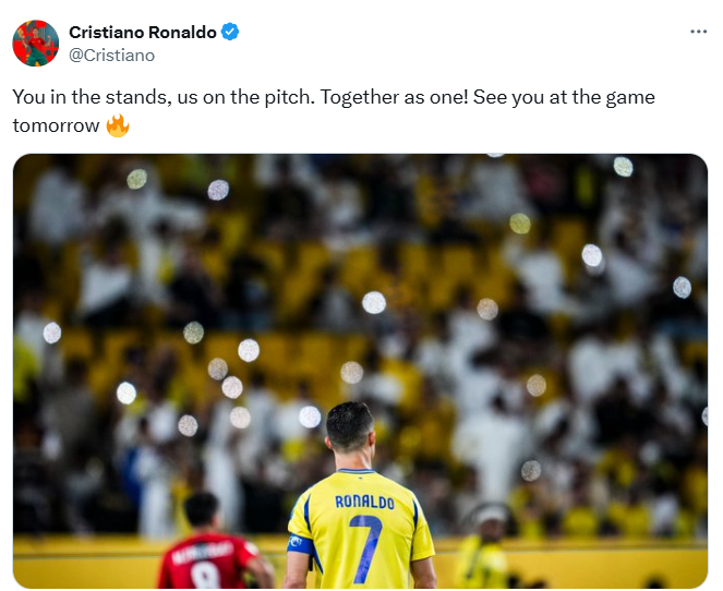وقبل المباراة نشر رونالدو رسالة إلى جماهير النصر قال فيها: "أنتم في المدرجات ونحن في الملعب، معًا كواحد! نراكم في المباراة غدًا"، في طلب من الجماهير لملء ملعب الأول بارك.