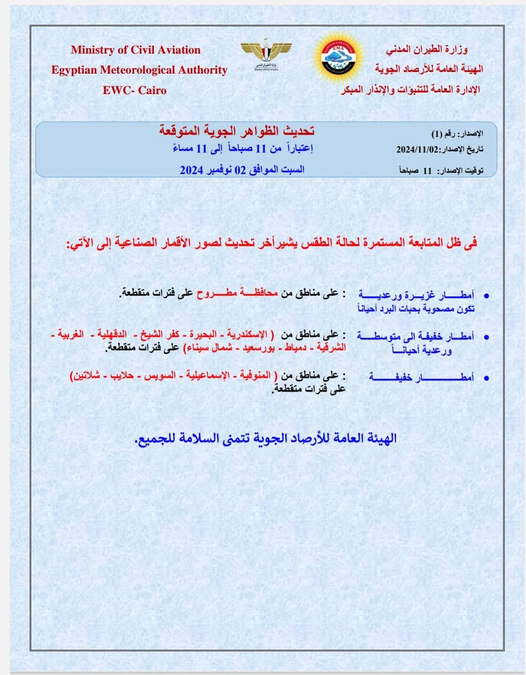- أمطار خفيفة على مناطق من ( المنوفية - الإسماعيلية - السويس - حلايب - شلاتين) على فترات متقطعة.
