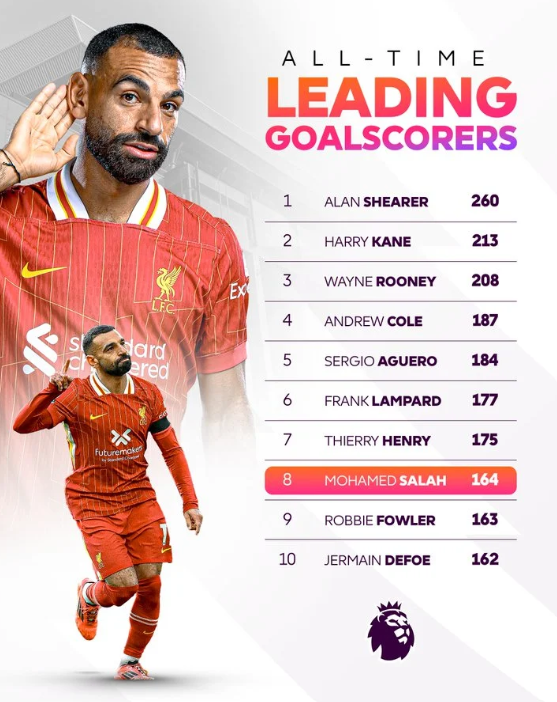 بهدفه في مباراة ليفربول وبرايتون، وصل صلاح إلى 164 هدفا في الدوري الإنجليزي الممتاز، لينفرد بالمركز الثامن في قائمة الهدافين التاريخيين للبريميرليج.