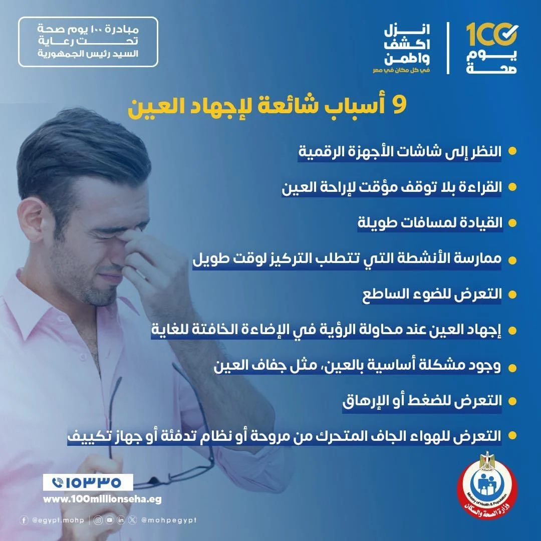 كشفت وزارة الصحة والسكان المصرية فى انفوجراف نشرته على صفحتها الرسمية على موقع التواصل الاجتماعى فيس بوك عن 9 أسباب شائعة لإجهاد العين تتضمن:-
