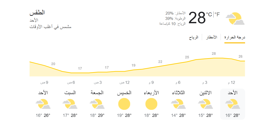 وتشير توقعات حالة الطقس اليوم إلى درجات الحرارة المتوقعة الأحد: القاهرة العظمى 26 درجة والصغرى 19، والإسكندرية العظمى 25 والصغرى 19، ومطروح العظمى 24 درجة والصغرى 17، وسوهاج العظمى 27 درجة، والصغرى 15، وقنا العظمى 29 درجة والصغرى 16، وأسوان العظمى 29 درجة والصغرى 17.