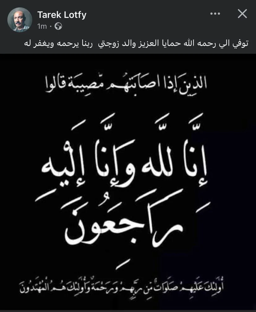 طارق لطفى.. تصدر اسم الفنان طارق لطفى مواقع التواصل بعدما أعلن عن وفاة والد زوجته وعلق قائلًا على صفحة فيس بوك: توفى إلى رحمة الله تعالى حمايا العزيز والد زوجتى ربنا يرحمه ويغفر له.