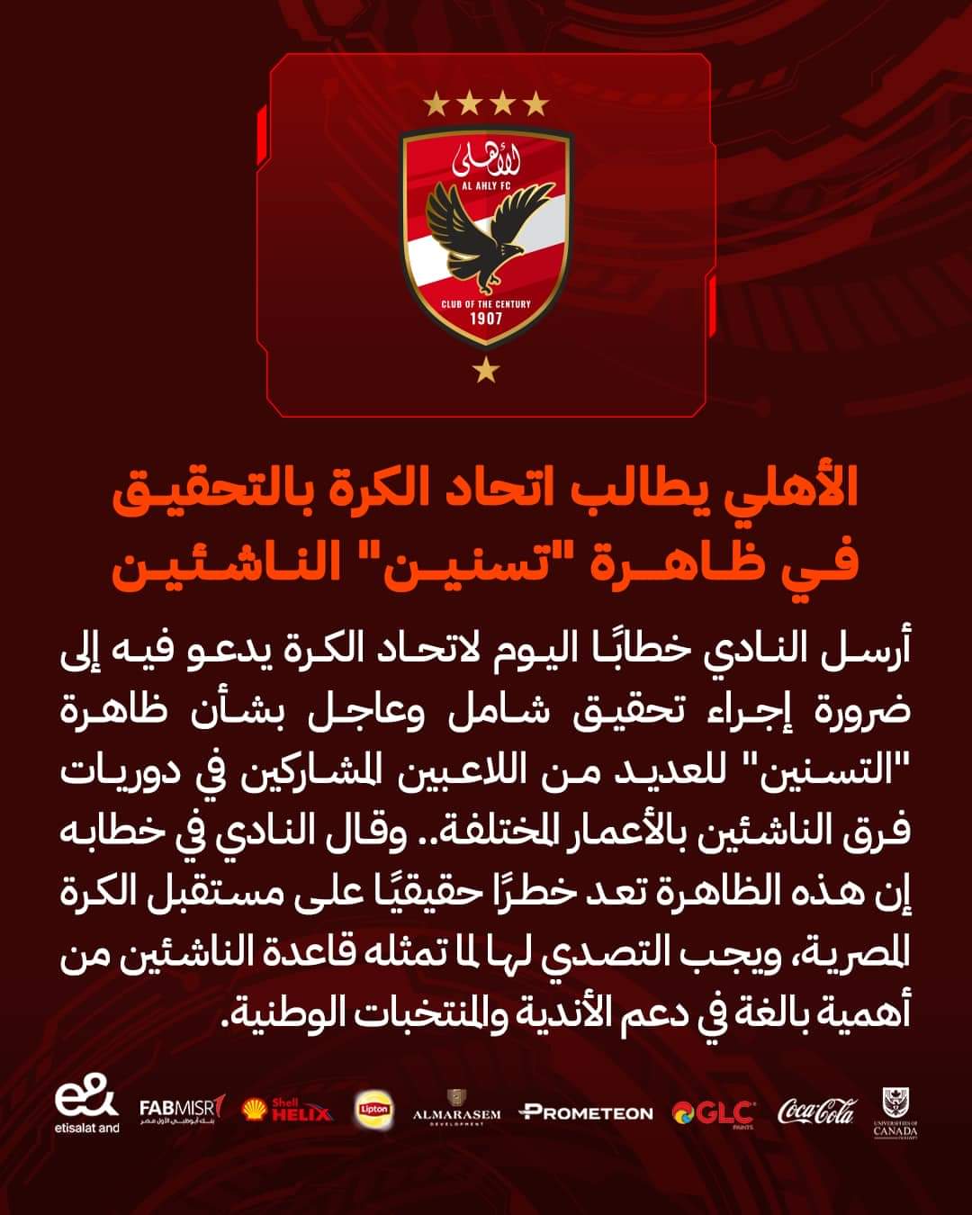 أرسل النادي الأهلي، اليوم الاثنين، خطابًا إلى الاتحاد المصري لكرة القدم، يدعو فيه إلى ضرورة إجراء تحقيق شامل وعاجل بشأن ظاهرة التسنين للعديد من اللاعبين المشاركين في دوريات فرق الناشئين بالأعمار المختلفة.