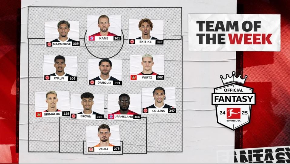 خط الهجوم: عمر مرموش (اينتراخت)، هاري كين (بايرن ميونخ)، هوجو إكيتيكي (آينتراخت).