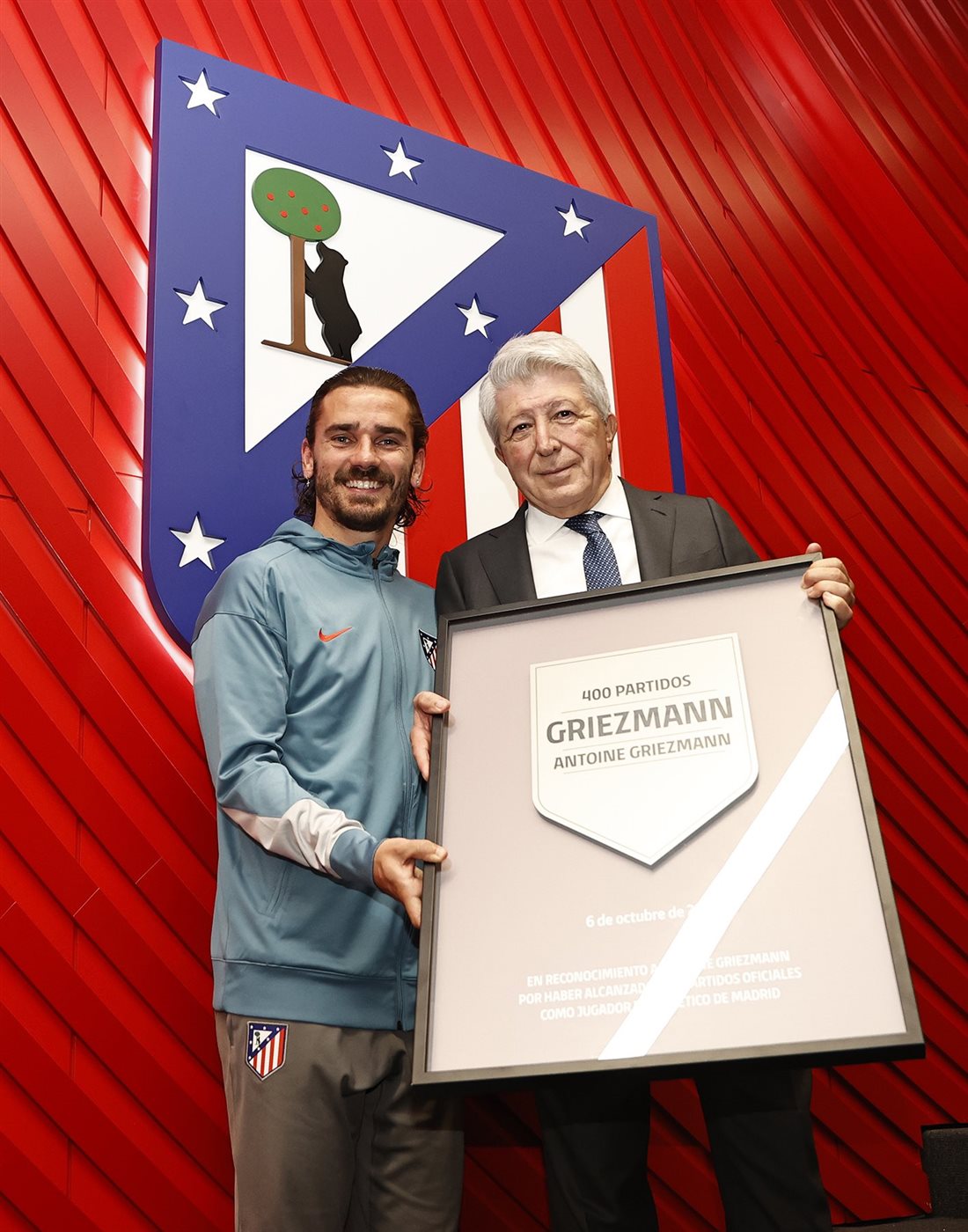 كرم نادي أتلتيكو مدريد الإسباني نجمه الفرنسي أنطوان جريزمان، اليوم الاثنين، نظرا لوصوله للمباراة رقم 400 بقميص الروخي بلانكوس.