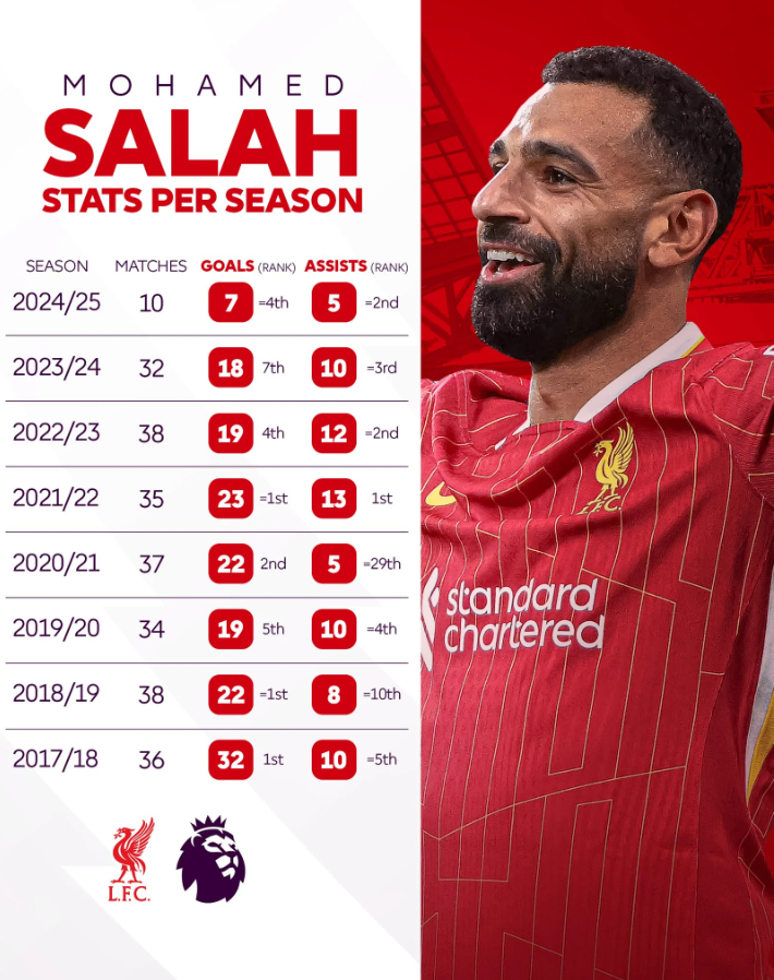وتخطى صلاح بفارق هدف عن أسطورة ليفربول روبي فاولر التاسع برصيد 163 هدفا، في القائمة التي يتصدرها الأسطورة الإنجليزي آلان شيرر برصيد 260 هدفا.