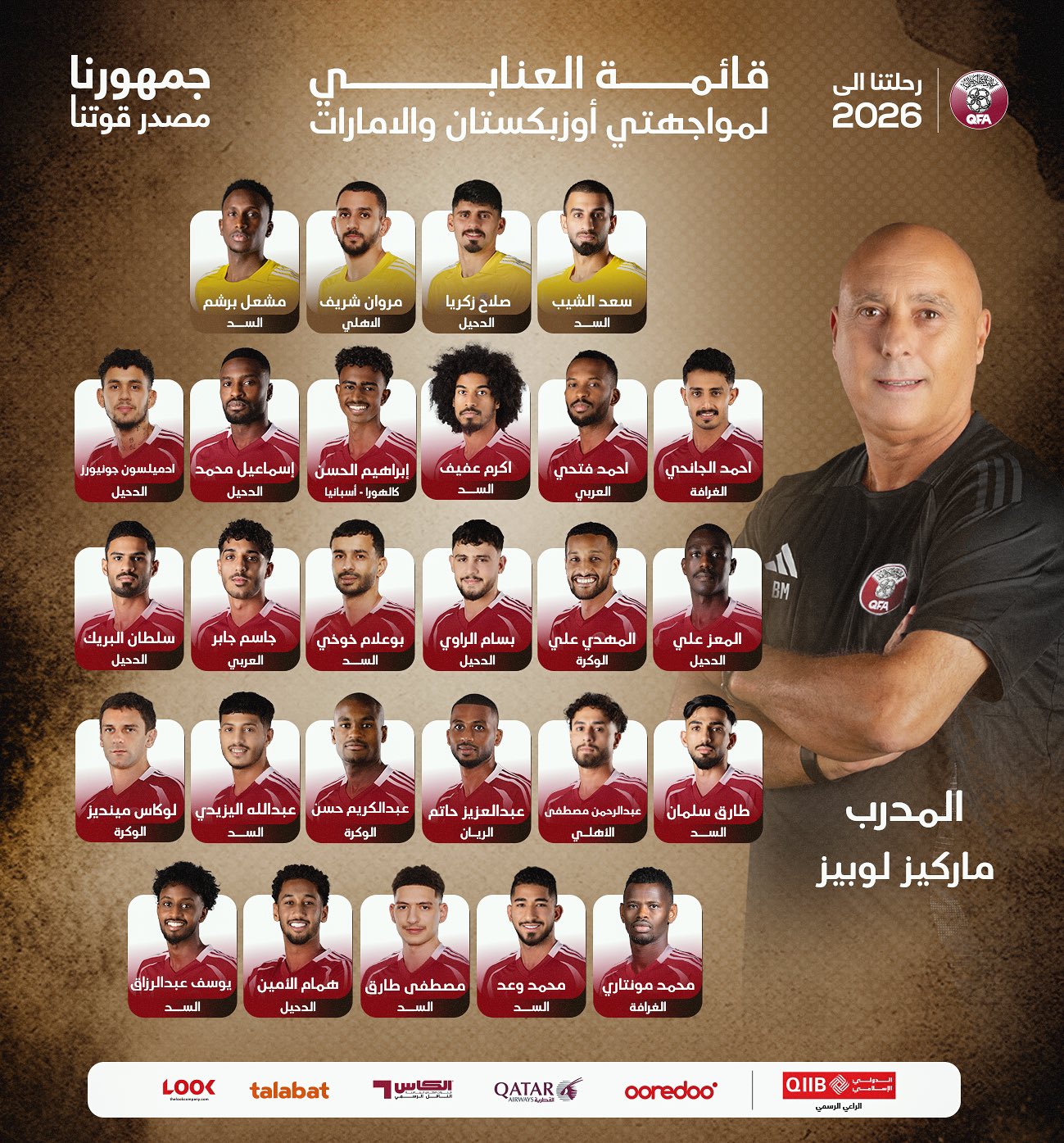 ويلعب منتخب قطر مباراتين في فترة التوقف الدولي المقبلة ضد كل من أوزبكستان والإمارات في تصفيات كأس العالم 2026.