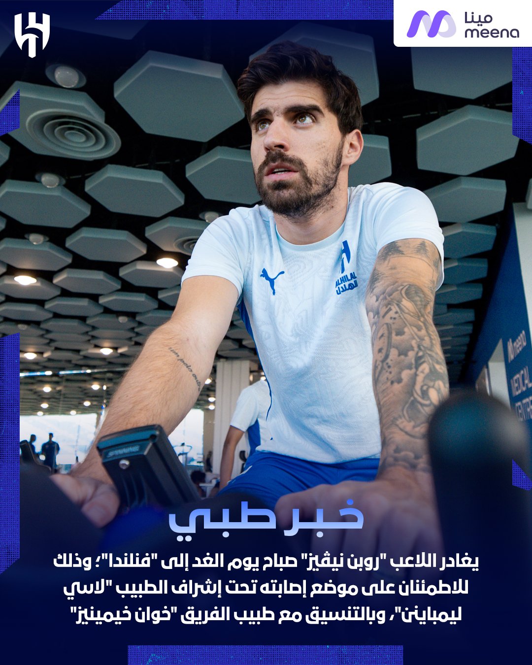 وكشف الهلال عن أن نيفيز سيسافر إلى فنلندا، غدا الخميس، للاطمئنان على موضع إصابته تحت إشراف الجهاز الطبي لناديه.