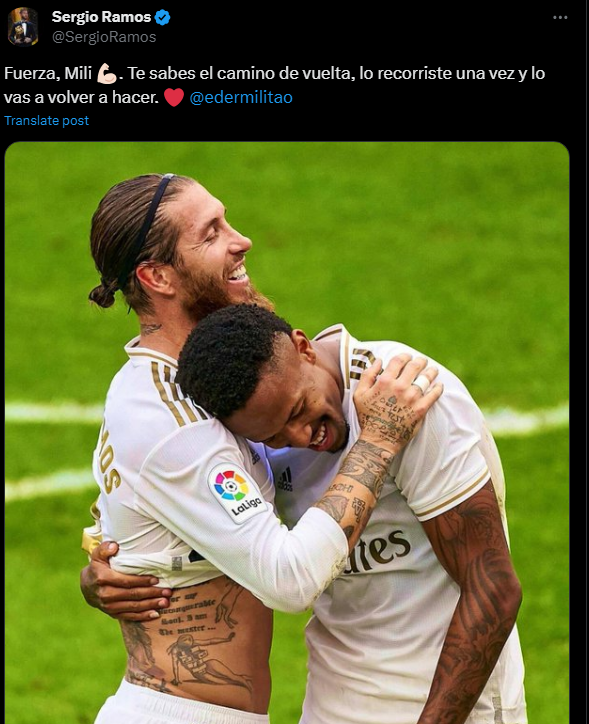 دعم الأسطورة الإسبانية سيرجيو راموس مدافع نادي ريال مدريد السابق، إيدير ميليتاو مدافع الفريق الحالي، عقب تعرضه للإصابة بقطع في الرباط الصليبي الأمامي في الساق اليمنى.