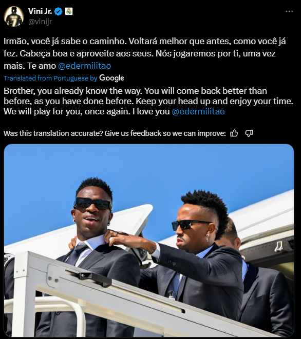 وقال فينيسيوس جونيور عبر حسابه الرسمي على موقع التواصل الاجتماعي "إكس"، موجهًا رسالة إلى إيدير ميليتاو: "أخي أنت تعرف الطريقة.. ستعود أفضل مما كنت عليه من قبل، تمامًا كما فعلت بالفعل".